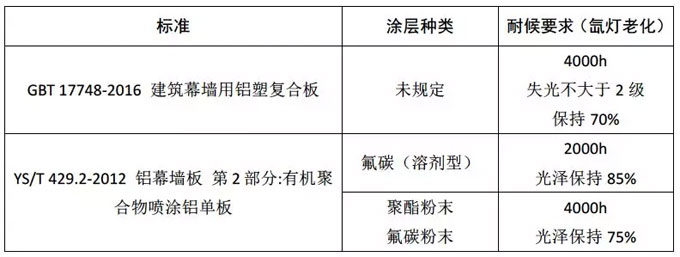 由于以上標(biāo)準(zhǔn)對于鋁板和鋁塑板用幕墻產(chǎn)品的涂層做了直接的規(guī)定,要求其耐候性必須達到較高的要求。在鋁板幕墻標(biāo)準(zhǔn)中直接規(guī)定了涂層的種類,而鋁塑板幕墻標(biāo)準(zhǔn)中雖然未規(guī)定涂層種類,但是其4000h的耐候要求根本是其他涂層無法企及的,氟碳涂層幾乎成為其為數(shù)不多的選擇。