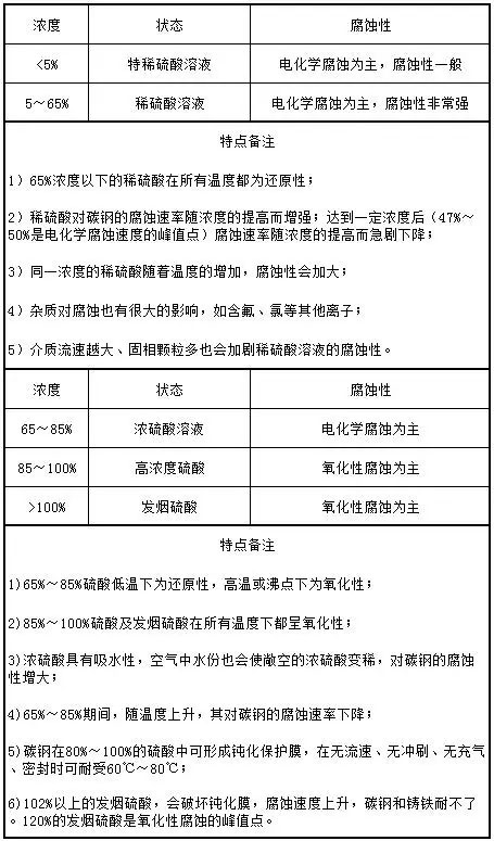 表1 市面上的硫酸常見的濃度、狀態及腐蝕特點